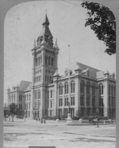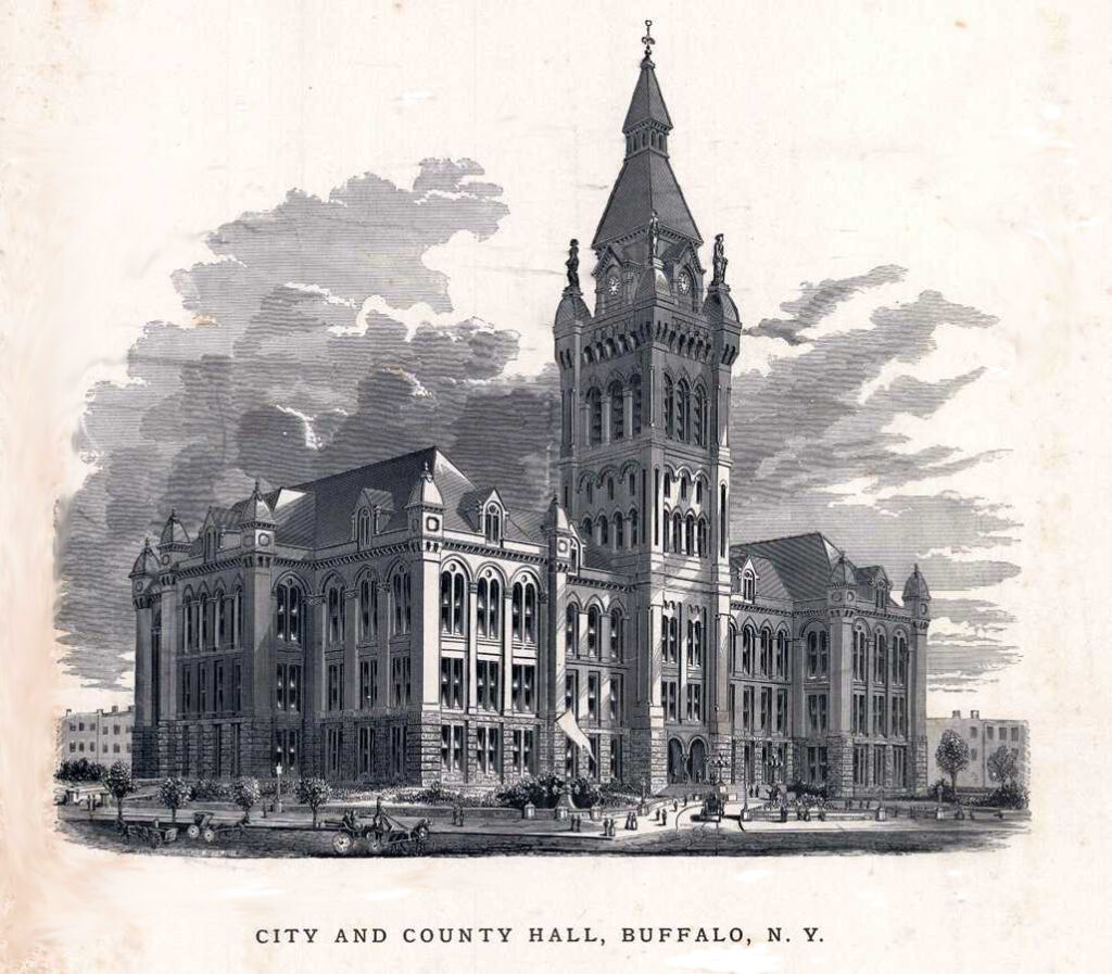 City and County Hall at 92 Franklin Street in Buffalo, now known as Old County Hall, was constructed beginning in 1871 and was dedicated in 1876. It originally housed the offices of both the City of Buffalo and the County of Erie. Andrew Jackson Warner of Rochester was the building’s architect. The building originally occupied a full city block, bordered by Franklin street on the east, Delaware avenue (then “street”) on the west, Church street on the south, and Eagle street on the north.